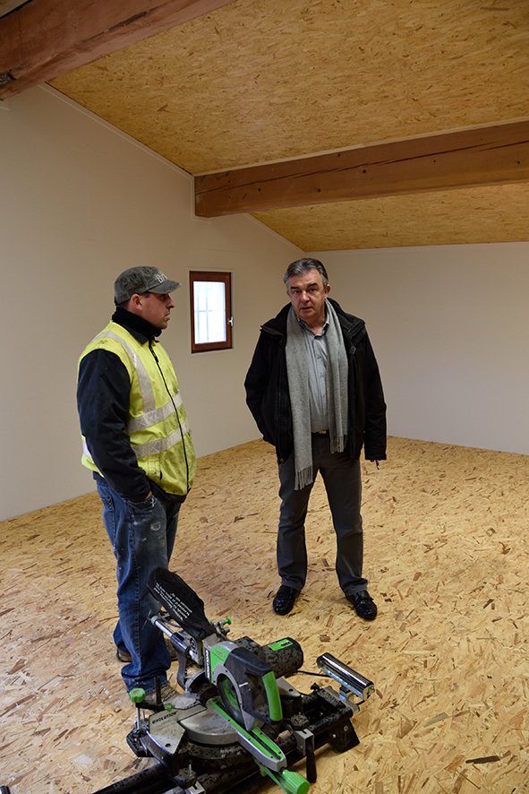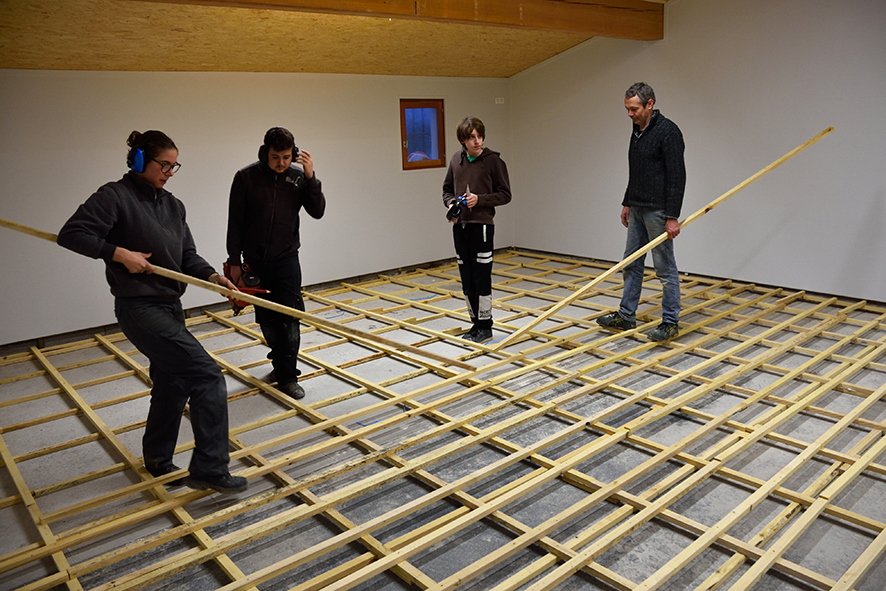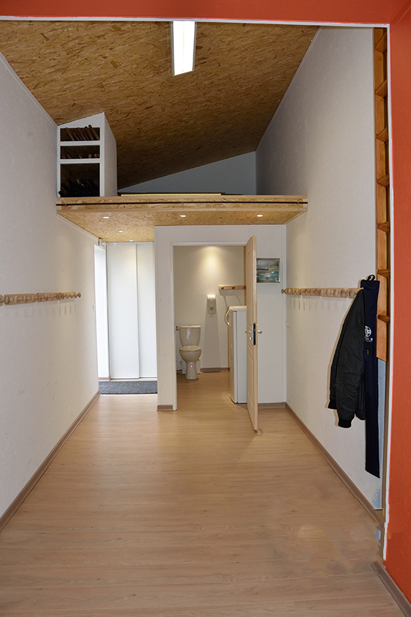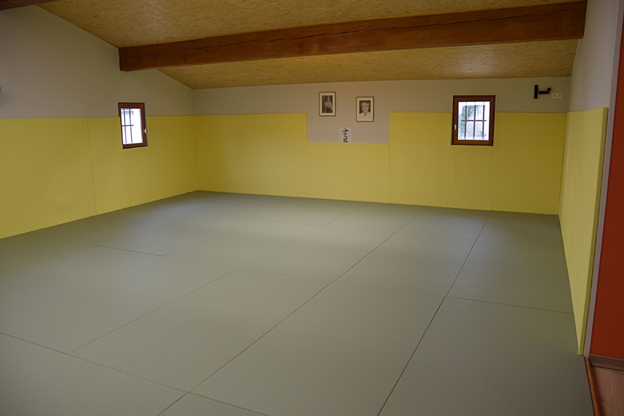 Janvier 2016 Construction du dojo Triple lambourdes au sol de façon à ce qu'il n'y ait aucun point du tapis en direct avec le sol, surmontées d'un plancher avant la pose du tapis Tapis au sol et tapis muraux et petit vestiaire mixte avec rangement sur la mezzanine pour les armes